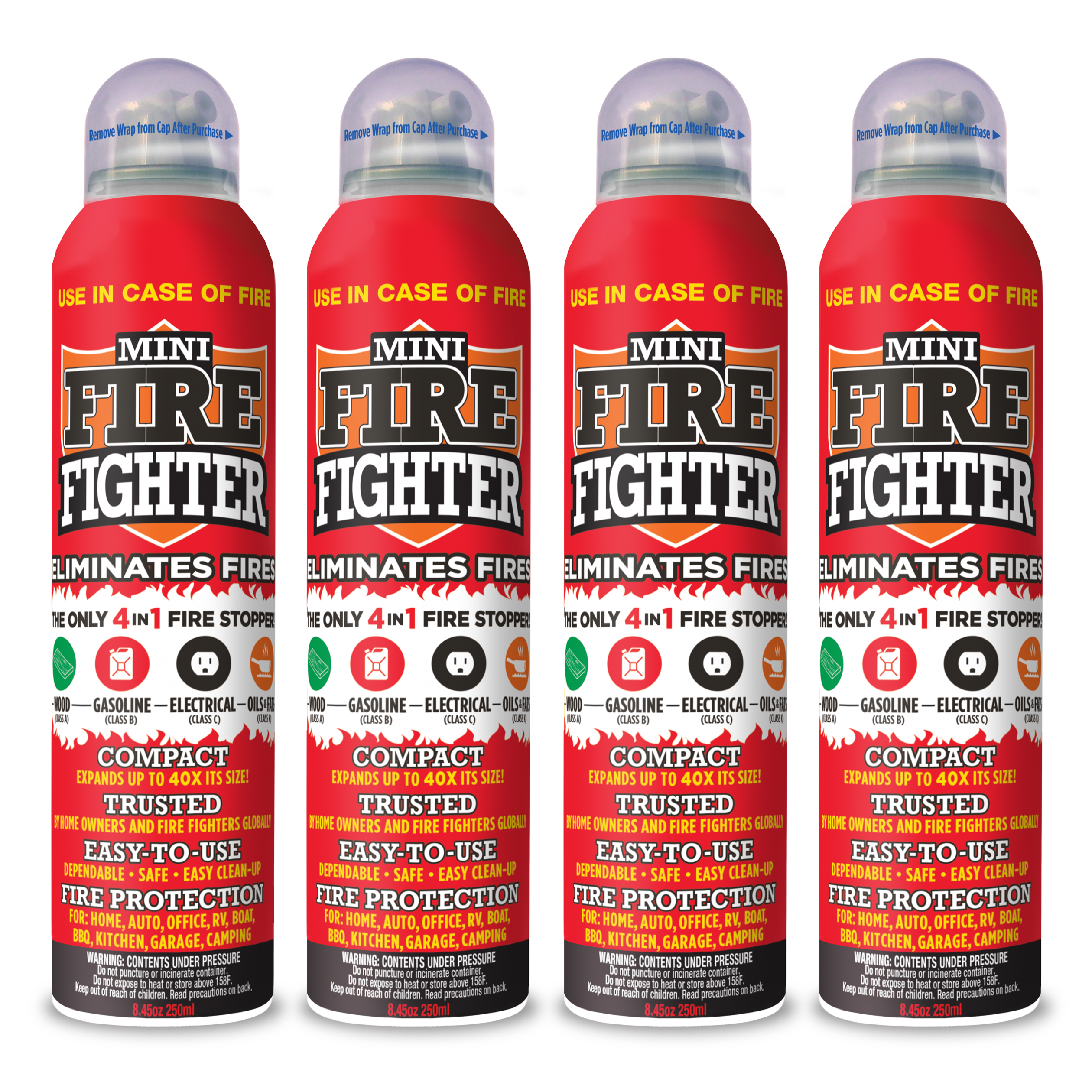 Mini Firefighter 4 pack. Eliminates more fire types. Easy, non toxic, no fuss – Mini Firefighter - stops small fires become a disaster