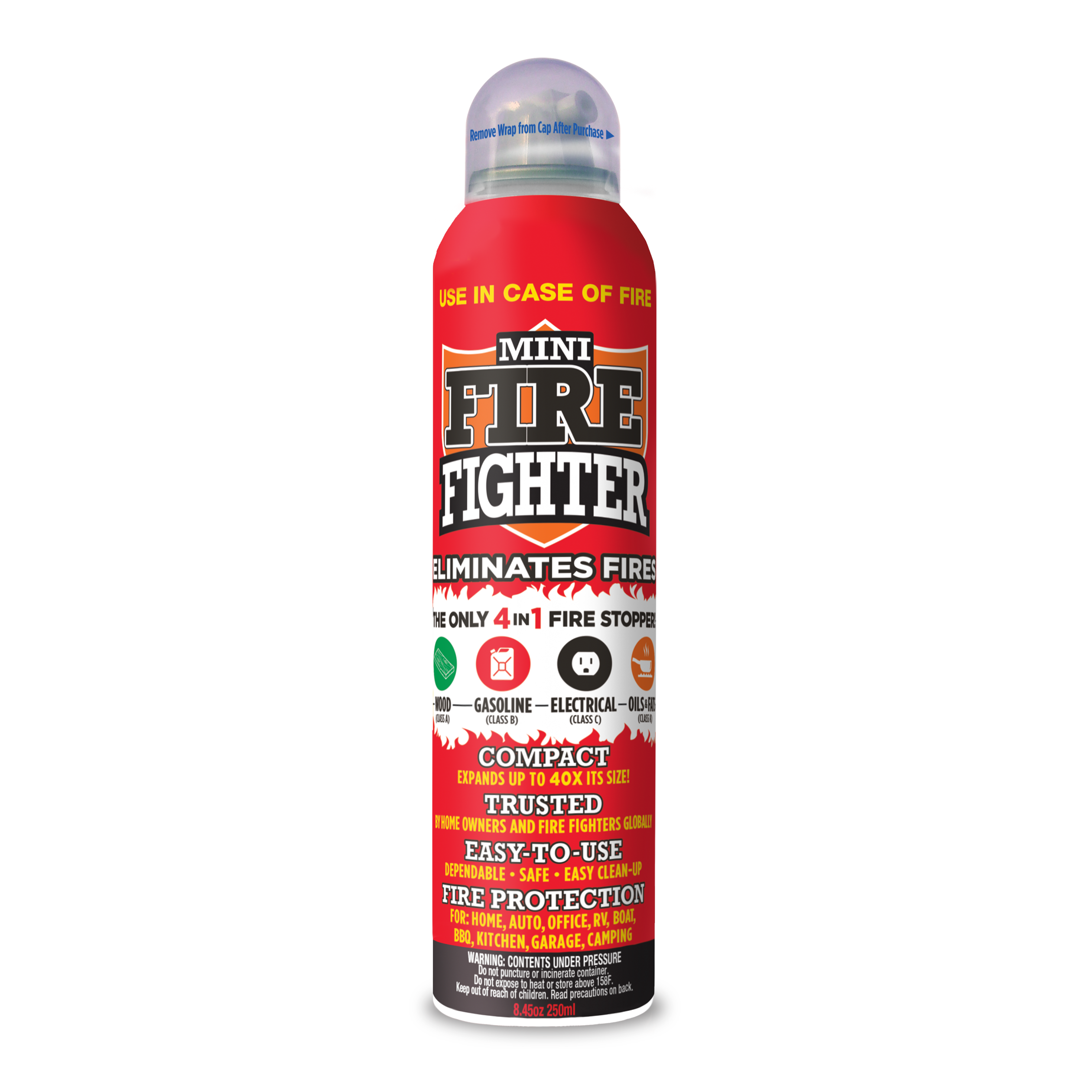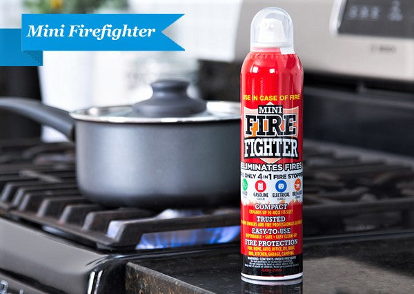 Mini Firefighter. Eliminates more fire types. Easy, non toxic, no fuss – Mini Firefighter - stops small fires become a disaster